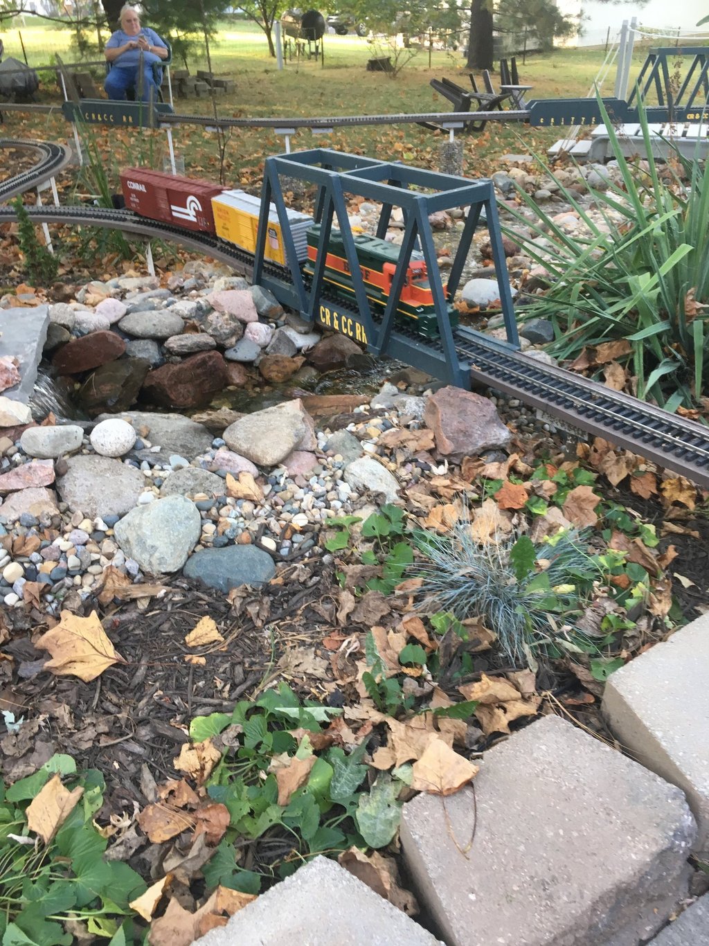 Native plantings and Critter Creek comprise the setting for a beautiful raised train operation.